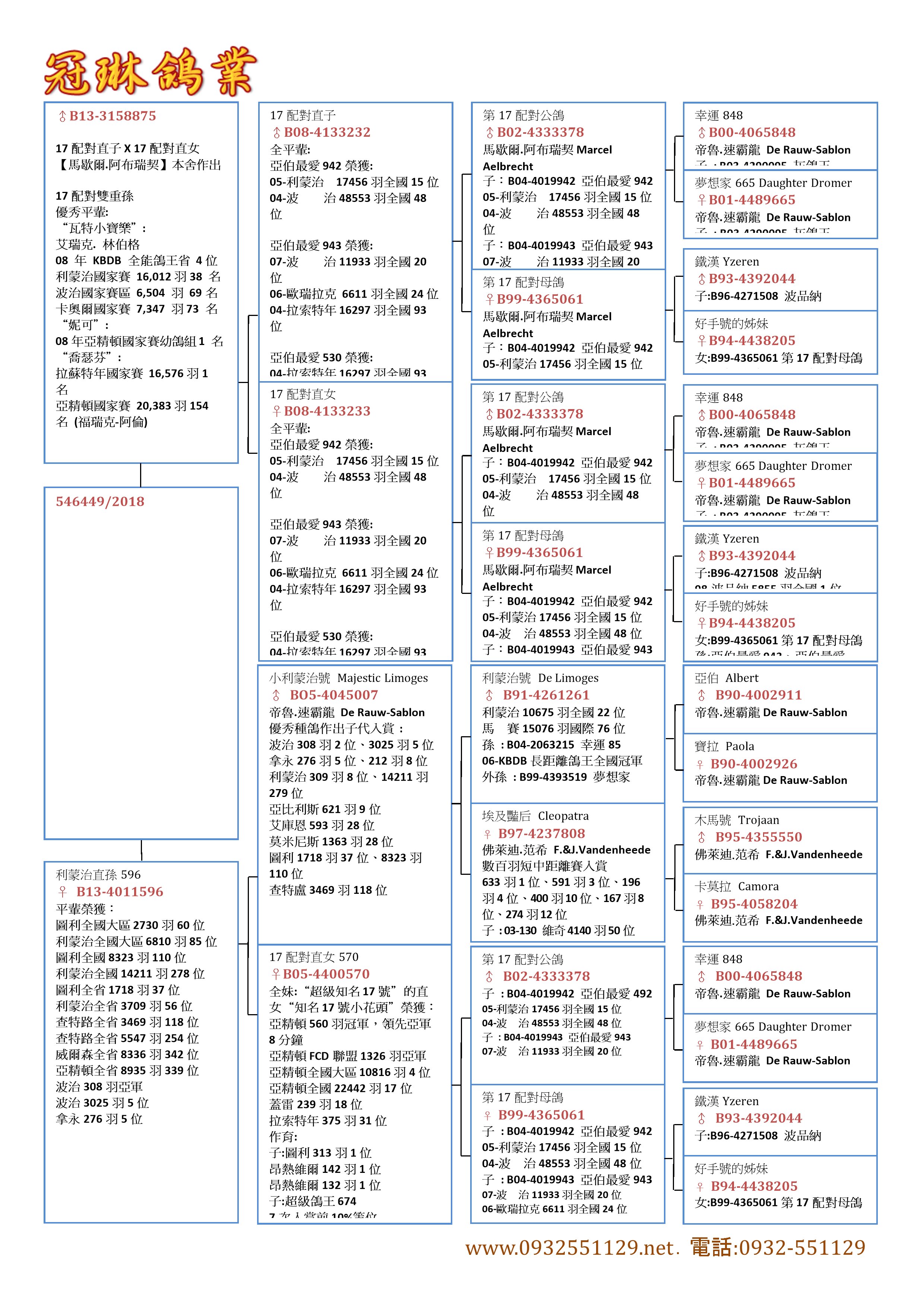 曾祖父:B02-4333378“第17配對公鴿” 馬歇爾.阿布瑞契Marcel Aelbrecht 子:B04-4019942 亞伯最愛942 05-利蒙治 17456羽全國15位 04-波 治48553羽全國48位 子:B04-4019943 亞伯最愛943 07-波 治11933羽全國20位 06-歐瑞拉克 6611羽全國24位 04-拉索特年16297羽全國93位 子:B06-4044530 亞伯最愛530 04-拉索特年16297羽全國93位 曾祖母:B99-4365061“第17配對母鴿” 馬歇爾.阿布瑞契Marcel Aelbrecht 子:B04-4019942 亞伯最愛942 05-利蒙治17456羽全國15位 04-波 治48553羽全國48位 子:B04-4019943 亞伯最愛943 07-波 治11933羽全國20位 06-歐瑞拉克 6611羽全國24位 04-拉索特年16297羽全國93位 子:B06-4044530 亞伯最愛530 06-蓋雷10670羽全國14位 母系鴿 外祖父:B05-4045007“小利蒙治號” 帝魯.速霸龍 De Rauw-Sablon 優秀種鴿作出子代入賞 : 波治308羽2位、3025羽5位 拿永276羽5位、212羽8位 利蒙治309羽8位、14211羽279位 亞比利斯621羽9位 艾庫恩593羽28位 莫米尼斯1363羽28位 圖利1718羽37位/8323羽110位 查特盧3469羽118位 外祖母:B05-4400570“第17配對直女570” 子:圖利313羽1位 昂熱維爾142羽1位 子:超級鴿王674 7次入賞前10%等位 B91-4261261“利蒙治號” 利蒙治10675羽全國22位 馬 賽15076羽國際76位 孫 : B04-2063215 幸運85 06-KBDB長距離鴿王全國冠軍 外孫 : B99-4393519 夢想家 曾孫 : B03-4290077 幸運77 05-KBDB長距離鴿王全國1位 曾孫 : B03-4290095 灰鴿王 B97-4237808“埃及豔后” 佛萊迪.范希 F.&J.Vandenheede 數百羽短中距離賽入賞 633羽1位-591羽3位-196羽-4位 400羽10位-167羽8位-274羽12位 子 : 03-130 維奇4140羽50位 曾 : B13-4034108 14-波治I 4397羽省賽1位/全國39位 帝安龐特-范拉克使翔 |
