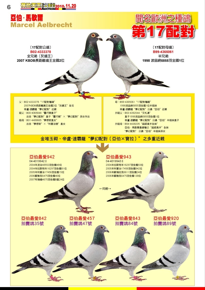 曾祖父:B02-4333378“第17配對公鴿” 馬歇爾.阿布瑞契Marcel Aelbrecht 子:B04-4019942 亞伯最愛942 05-利蒙治 17456羽全國15位 04-波 治48553羽全國48位 子:B04-4019943 亞伯最愛943 07-波 治11933羽全國20位 06-歐瑞拉克 6611羽全國24位 04-拉索特年16297羽全國93位 子:B06-4044530 亞伯最愛530 04-拉索特年16297羽全國93位 曾祖母:B99-4365061“第17配對母鴿” 馬歇爾.阿布瑞契Marcel Aelbrecht 子:B04-4019942 亞伯最愛942 05-利蒙治17456羽全國15位 04-波 治48553羽全國48位 子:B04-4019943 亞伯最愛943 07-波 治11933羽全國20位 06-歐瑞拉克 6611羽全國24位 04-拉索特年16297羽全國93位 子:B06-4044530 亞伯最愛530 06-蓋雷10670羽全國14位 母系鴿 外祖父:B05-4045007“小利蒙治號” 帝魯.速霸龍 De Rauw-Sablon 優秀種鴿作出子代入賞 : 波治308羽2位、3025羽5位 拿永276羽5位、212羽8位 利蒙治309羽8位、14211羽279位 亞比利斯621羽9位 艾庫恩593羽28位 莫米尼斯1363羽28位 圖利1718羽37位/8323羽110位 查特盧3469羽118位 外祖母:B05-4400570“第17配對直女570” 子:圖利313羽1位 昂熱維爾142羽1位 子:超級鴿王674 7次入賞前10%等位 B91-4261261“利蒙治號” 利蒙治10675羽全國22位 馬 賽15076羽國際76位 孫 : B04-2063215 幸運85 06-KBDB長距離鴿王全國冠軍 外孫 : B99-4393519 夢想家 曾孫 : B03-4290077 幸運77 05-KBDB長距離鴿王全國1位 曾孫 : B03-4290095 灰鴿王 B97-4237808“埃及豔后” 佛萊迪.范希 F.&J.Vandenheede 數百羽短中距離賽入賞 633羽1位-591羽3位-196羽-4位 400羽10位-167羽8位-274羽12位 子 : 03-130 維奇4140羽50位 曾 : B13-4034108 14-波治I 4397羽省賽1位/全國39位 帝安龐特-范拉克使翔 |